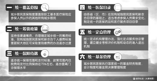 为整合城乡居民基本医保,《意见》提出“六统一”的要求:统一覆盖范围、统一筹资政策、统一保障待遇、统一医保目录、统一定点管理、统一基金管理。